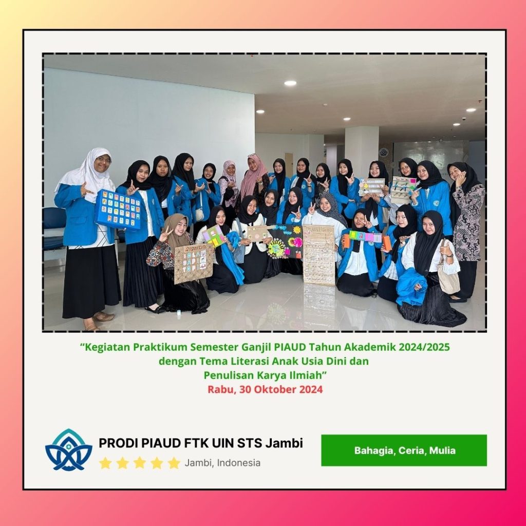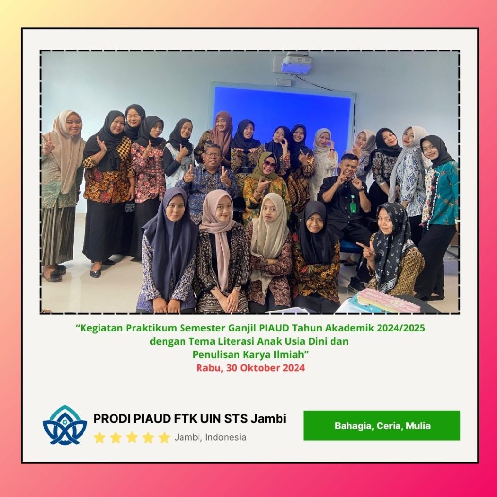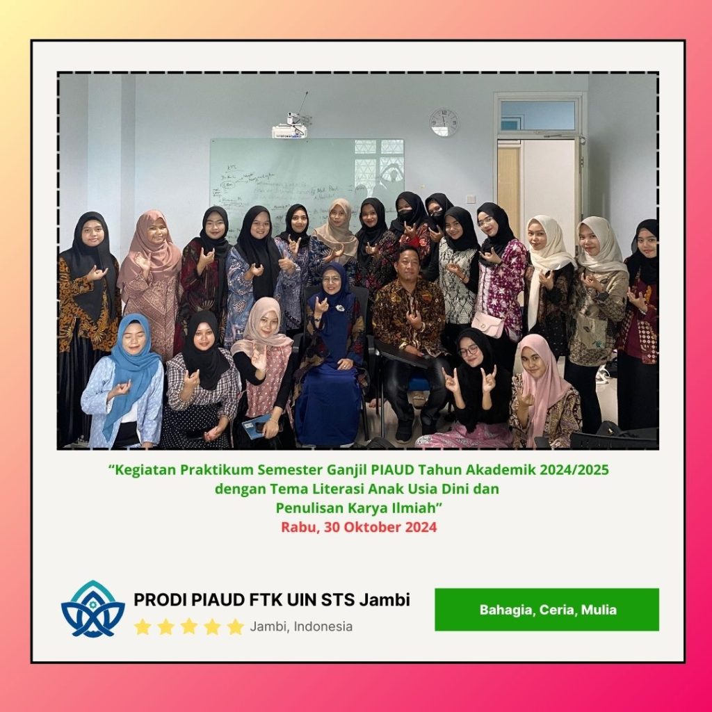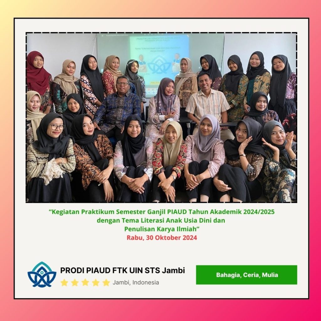 Jambi, Kampus Reservasi Kebaikan dan Keunggulan – Program Studi Pendidikan Islam Anak Usia Dini (PIAUD) Universitas Islam Negeri (UIN) Sulthan Thaha Saifuddin Jambi. Mengadakan kegiatan praktikum mahasiswa di semester Ganjil ini dengan Tema Literasi Anak Usia Dini dan Penulisan Karya Ilmiah. Husin, M.Pd.I (Ketua Panitia sekaligus Sesprodi PIAUD) Mengungkapkan bahwa praktikum ini merupakan kegiatan rutin persemesternya guna untuk meningkatkan kemampuan mahasiswa PIAUD dibidang Literasi dan Penulisan Karya Ilmiah. 30 Oktober 2024